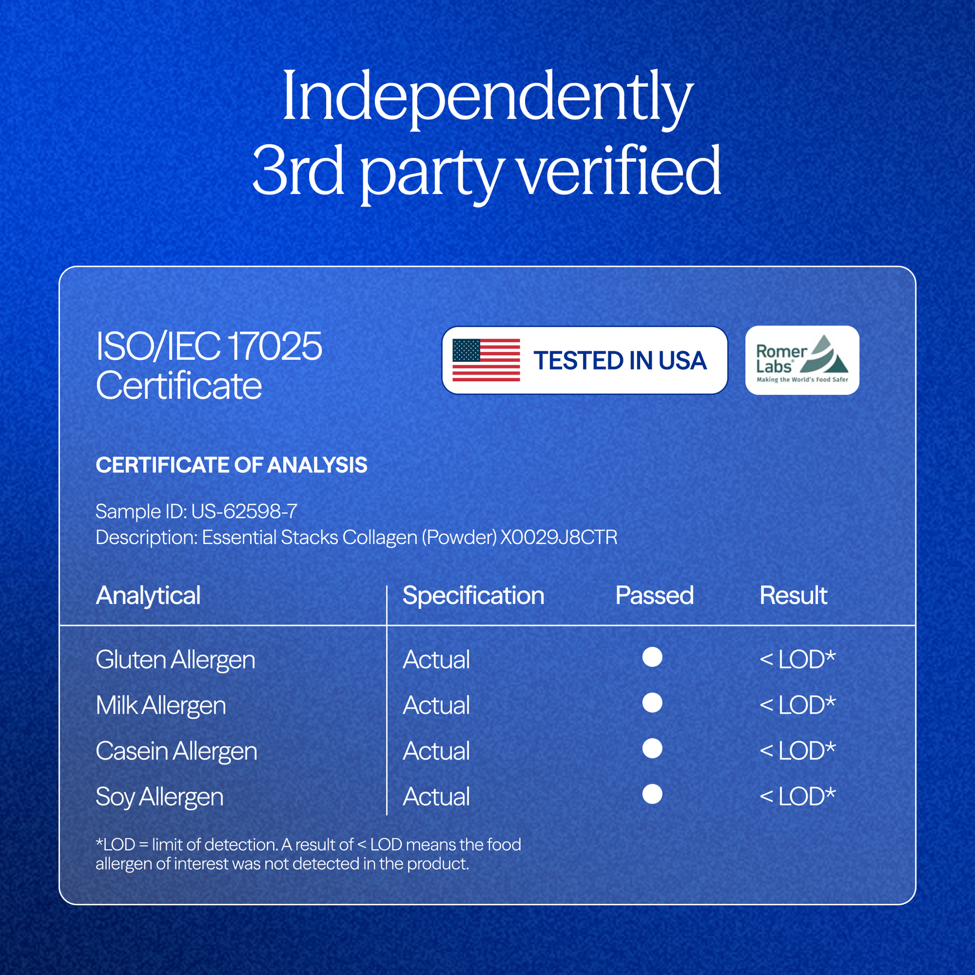 We partner exclusively with ISO 17025 accredited laboratories here in the USA to test for common allergens, heavy metals and microbiological contaminants. View certificate of analysis below.