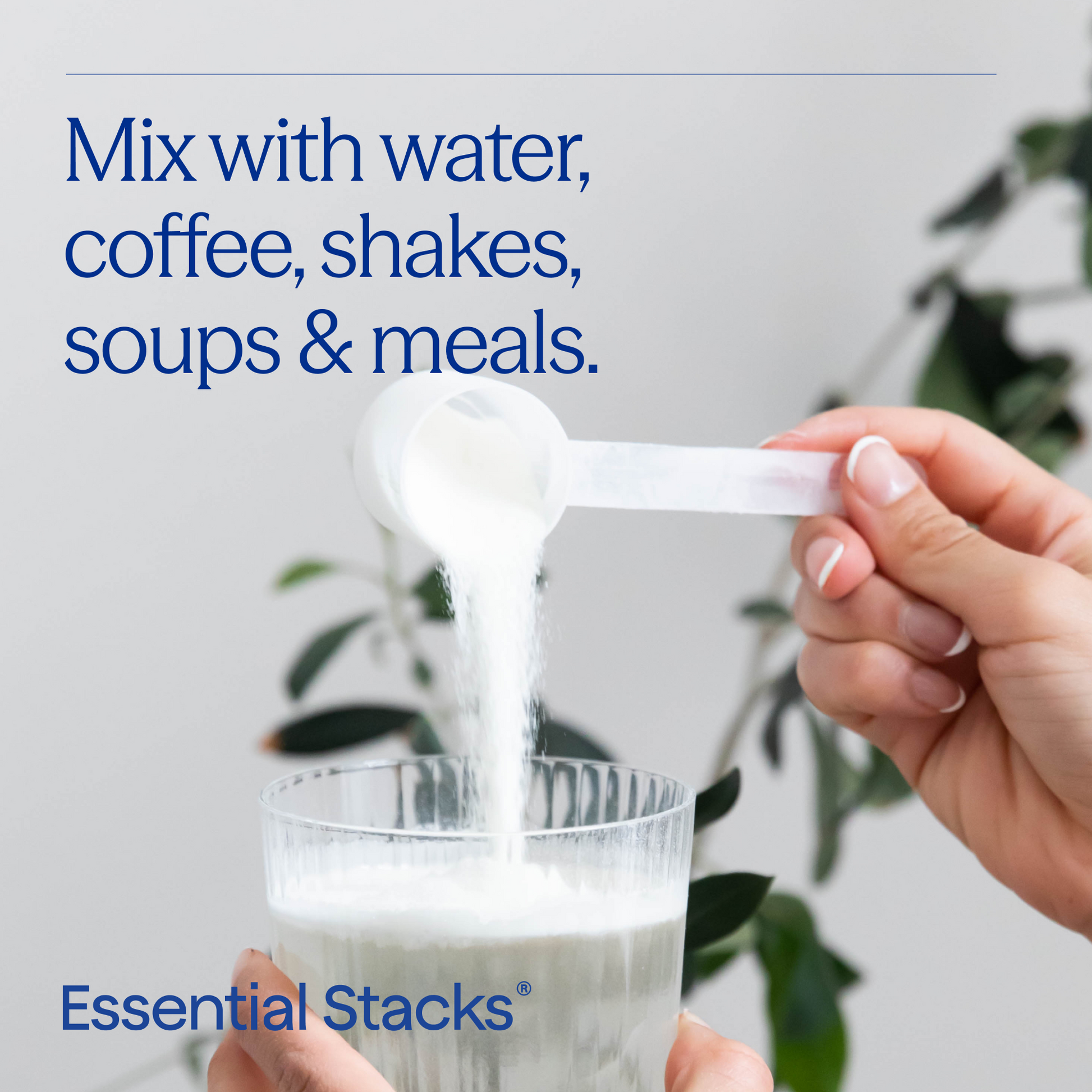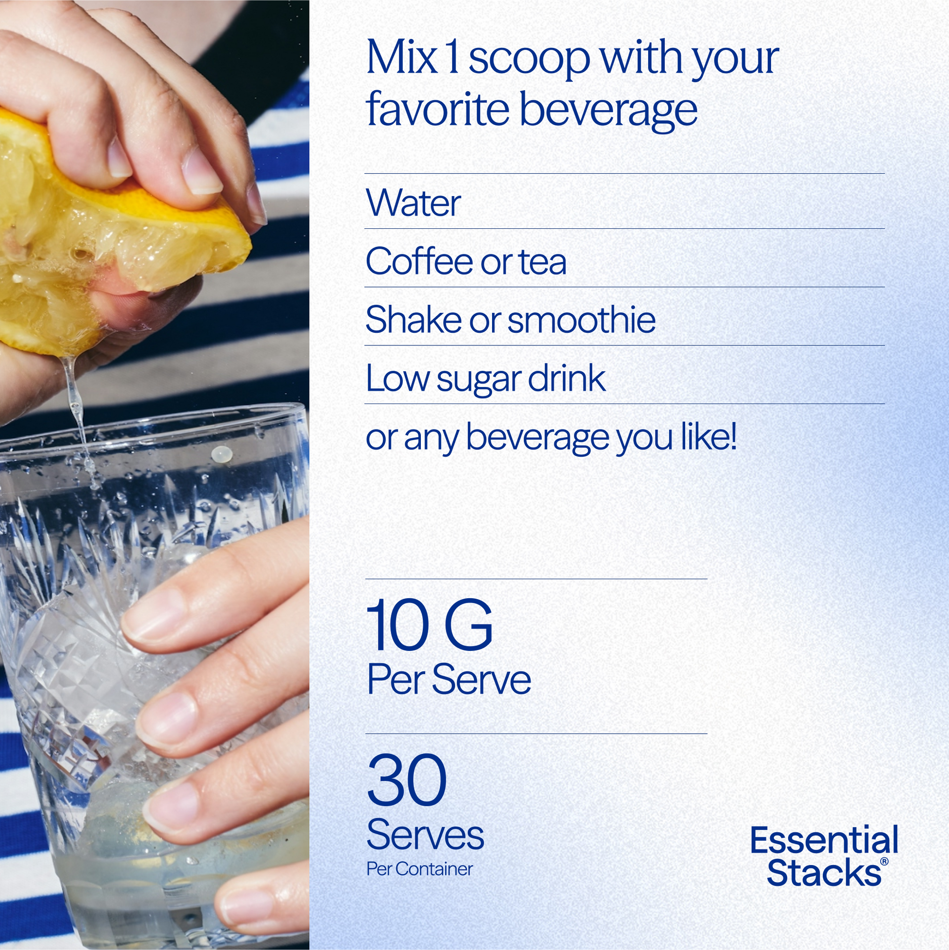 Mix 1 scoop (10g) with 8 ounces of water or your favorite beverage, 1-2 times daily. It mixes easily into water, coffee, shakes, soups, and meals. Avoid ice-cold water to prevent clumping.