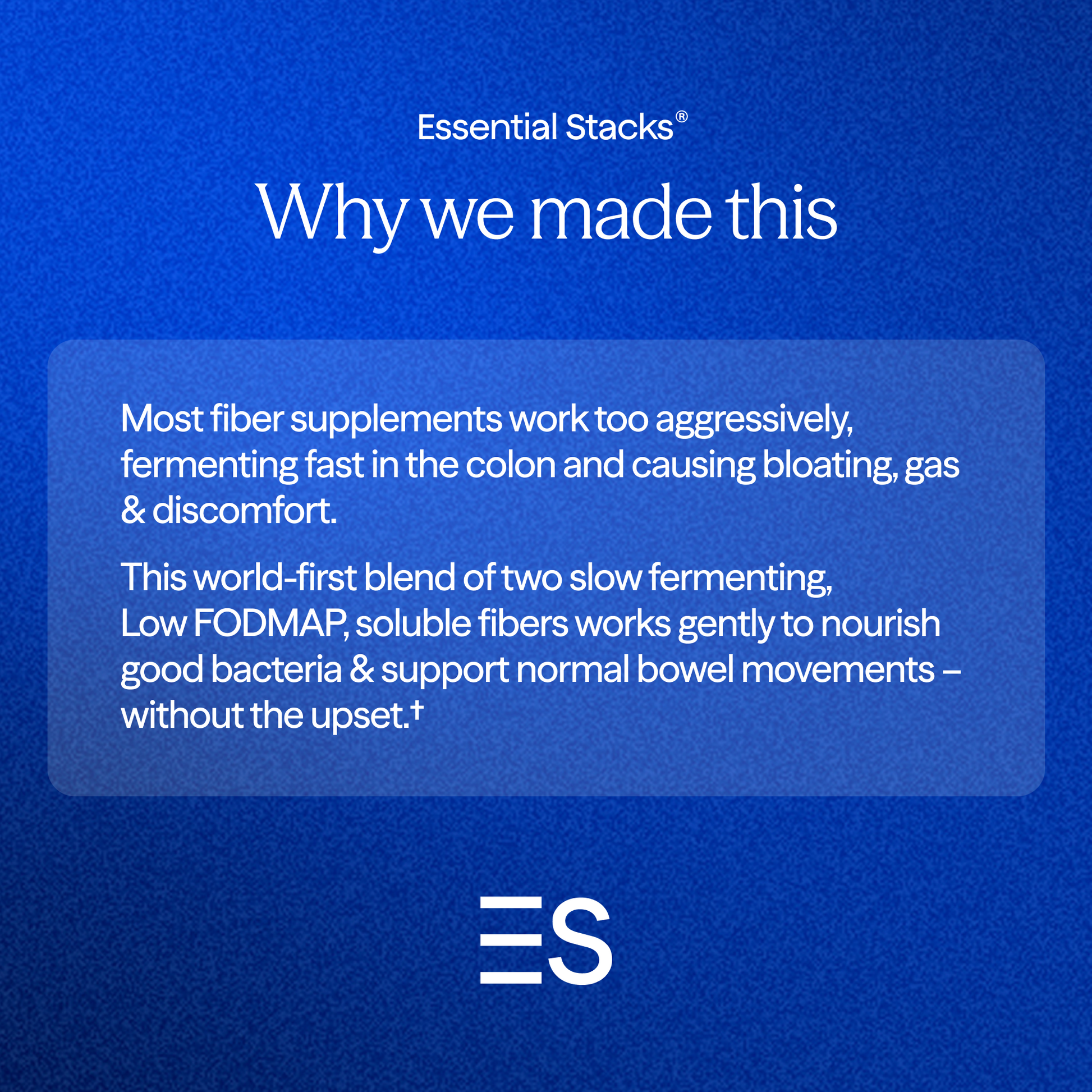 Most fiber supplements work too aggressively, fermenting fast in the colon and causing bloating, gas & discomfort. This world-first blend of two slow fermenting, low FODMAP, soluble fibers works gently to nourish good bacteria & support normal bowel movements – without the upset.† Exclusively made with organic-grade Sunfiber (PHGG - partially hydrolyzed guar gum) & Acacia fiber, and 3rd party tested in the USA, this is the gold standard in prebiotic fiber support.